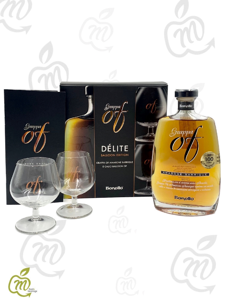 Contiene una bottiglia di Grappa OF Amarone Barrique da 35cl 42%Vol. e due calici Balloon.Dèlite OF Balloon Edition è l'originale set da degustazione che racchiude al suo interno la prestigiosa Grappa OF Amarone Barrique e due calici balloon Bonollo OF.