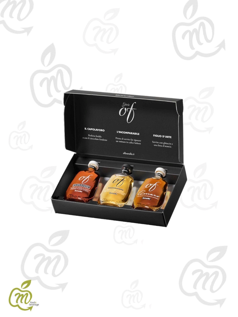 Contiene una piccola bottiglia di Grappa OF Amarone Barrique 5 cl 42% Vol., una piccola bottiglia di Dorange OF 5 cl 40% Vol. e una piccola bottiglia di Amaro OF 5 cl 30% Vol.