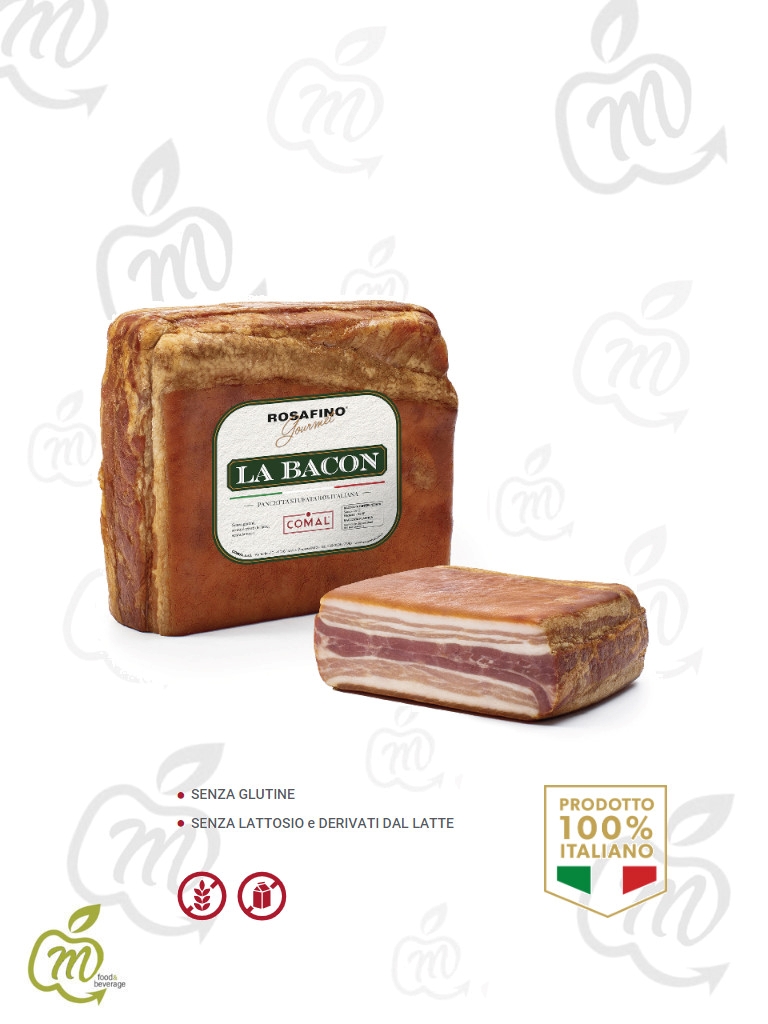 Pancetta ottenuta da solo carne di suino 100% italiano. Il processo di lavorazione prevede l’unione di due pancette con cotenna, cotte lentamente al vapore e leggermente affumicate in modo naturalecon trucioli di legno di Faggio. È un salume dal gusto p
