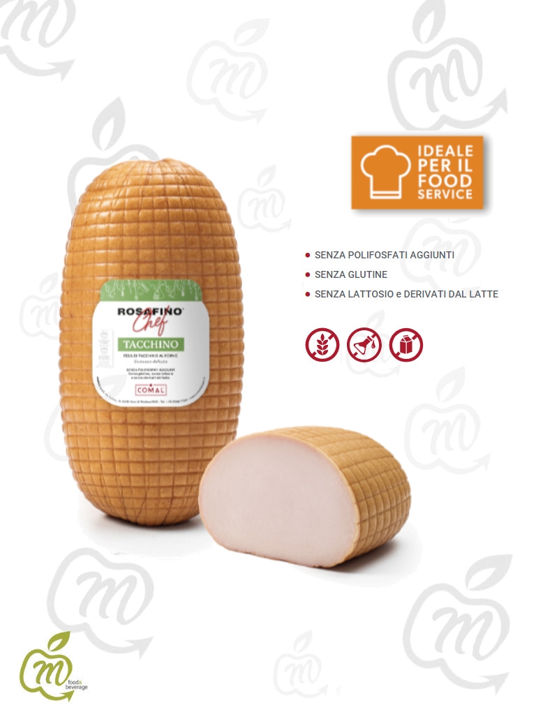 Il petto di tacchino al forno è ottenuto da tagli freschi selezionati, viene cotto al vapore e arricchito da spezie e aromi naturali. Tratto caratteristico del prodotto è la doratura esterna e un aspetto “tartarugato” caratteristici del prodotto. Alimento