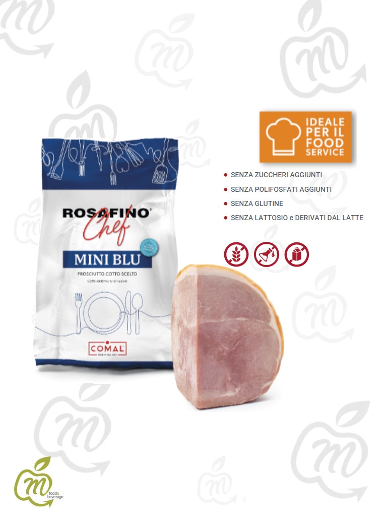 Mini Blu è un prosciutto Cotto Scelto realizzato esclusivamente con cosce intere di suino accuratamente selezionate. Queste vengono lentamente cotte al vapore e lavorate con cura per garantirne la massima qualità.SENZA ZUCCHERI AGGIUNTISENZA POLIFOSFA