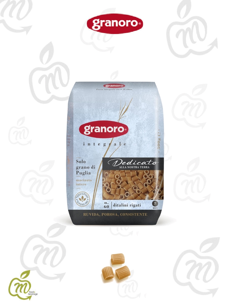 Granoro Dedicato Integrale è ottenuta esclusivamente da grano duro coltivato in Puglia. Trasformato in semola attraverso un processo di macinazione lenta, ne preserva le proprietà nutrizionali e le fragranze naturali. Una pasta integrale, a filiera, corta