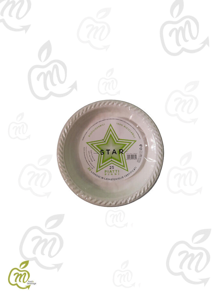 Piatti piani in plastica riutilizzabile. 100% riciclabili. Diametro 22cm. Colore bianco. Confezione da 25 pezzi.
